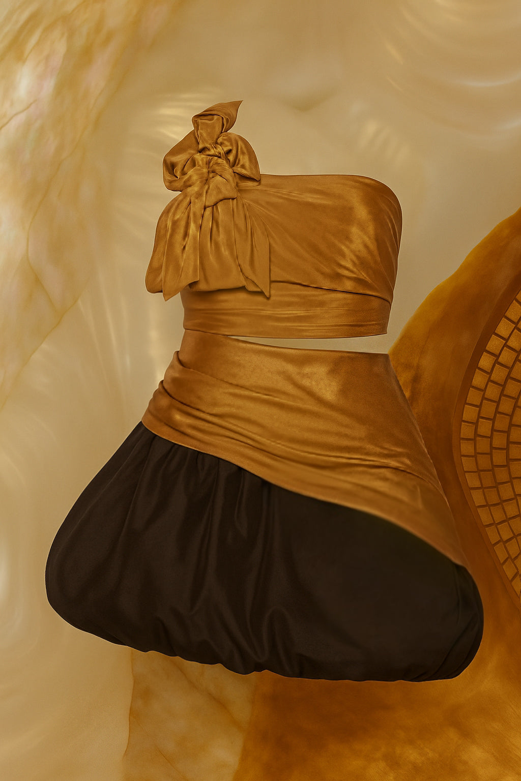 The Auric Muse two piece set is designed to shine from day to night. The cropped bronze top adds sculptural drama while the slanted balloon skirt brings movement and bold resort energy. Crafted in glowing bronze gold with a playful silhouette, she is equal parts statement and effortless.